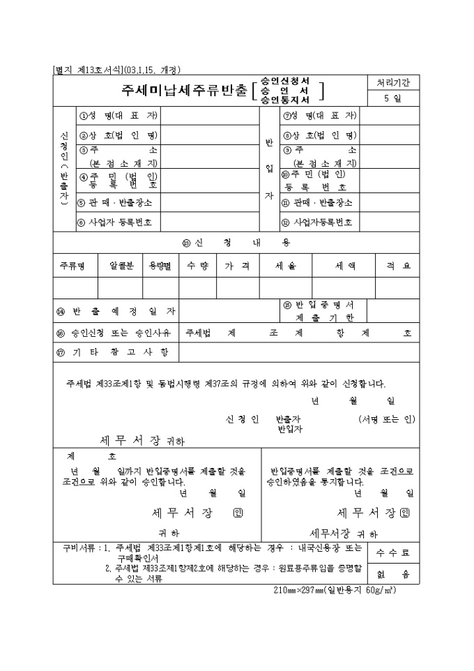 주세법 제33조제1항 및 동법시행령 제37조의 규정에 의한 제13호 주세미납세주류반출승인신청서(승인서·승인통지서)로 신청인과 반입자 인적사항,신청주류내용을 기록합니다. (2003.1.15. 개정)