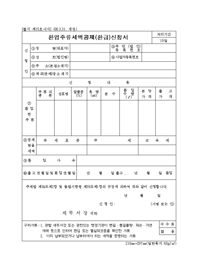 주세법 제34조제2항 및 동법시행령 제39조제1항의 규정에 의한 제15호 환입주류세액공제(환급)신청서로 신청인 인적사항,환입한 주류내용,공제받을 세액,환입사유,출고연월일 및 환입연월일을 기록합니다. (2000.3.31. 개정)