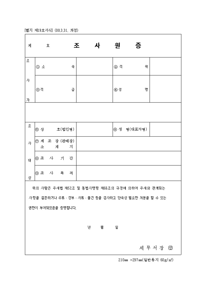 9,000원/월주세법 제52조 및 동법시행령 제66조의 규정에 의하여 주세와 관계되는 사항을 질문하거나 주류·장부·서류·물건 등을 검사하고 단속상 필요한 처분을 할 수 있는 권한이 부여되었음을 증명하는 제19호 조사원증입니다. (2000.3.31. 개정)