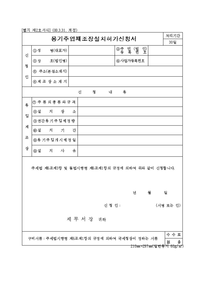 주세법 제6조제3항 및 동법시행령 제6조제1항의 규정에 의한 제2호 용기주입제조장설치허가신청서로 신청인 인적사항,용입제조장 내용을 기록합니다. (2000.3.31. 개정)