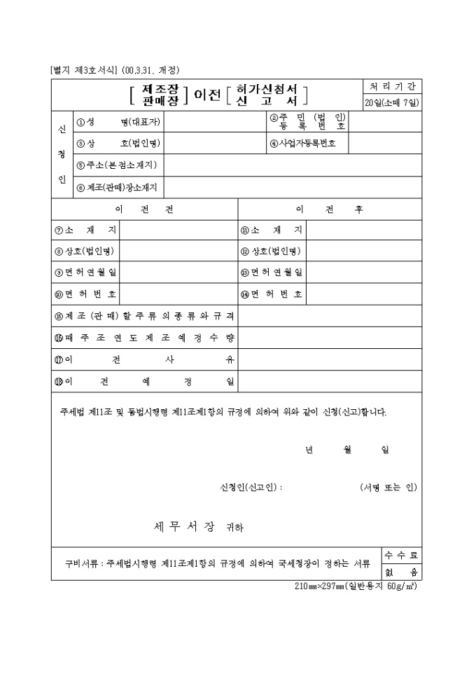 주세법 제11조 및 동법시행령 제11조제1항의 규정에 의한 제3호 제조장(판매장)이전허가신청서(신고서)로 신청인 인적사항,제조장 이전전과 이전후의 내용을 기록합니다. (2000.3.31. 개정)