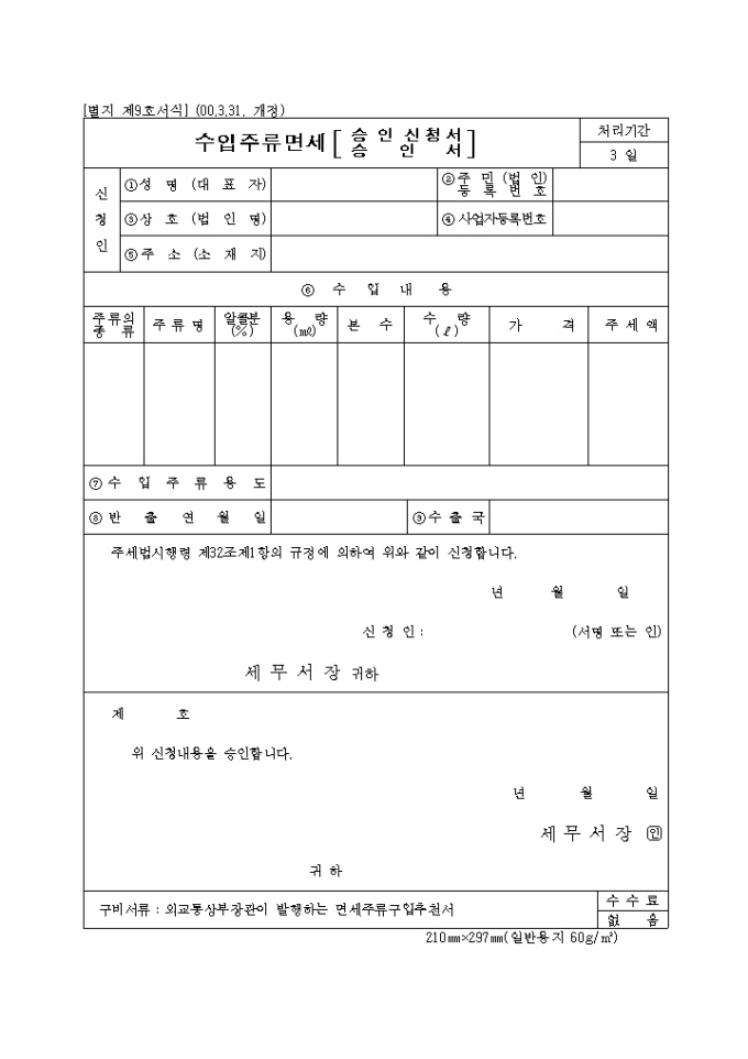 수입주류면세승인신청서(승인서)(제9호)(2000.3.31. 개정)