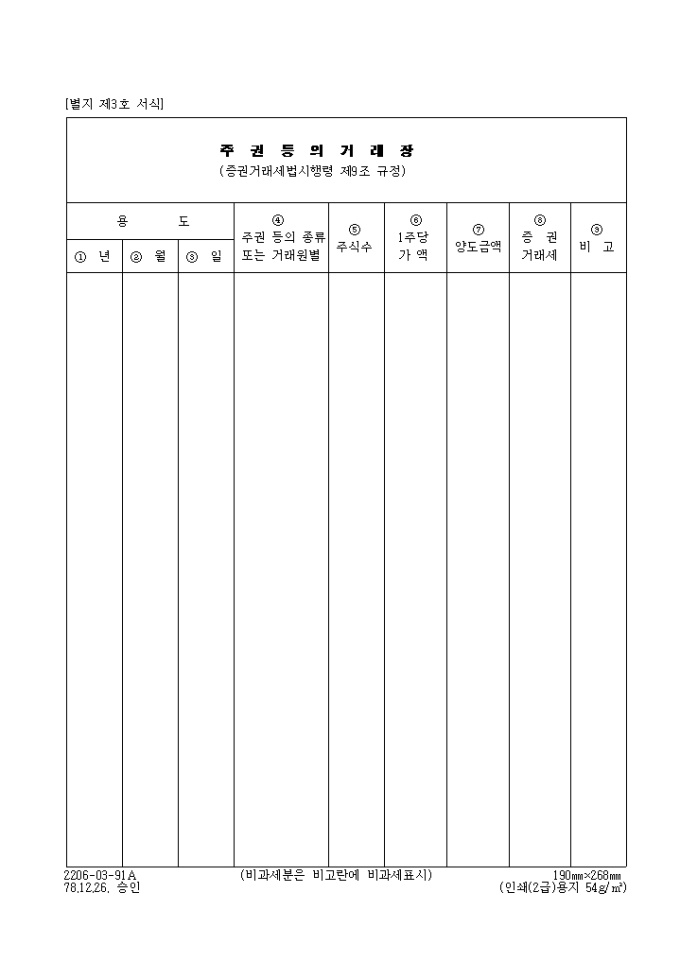 9,000원/월용도,주권 등의 종류 또는 거래원별,주식수,1주당 가액,양도금액,증권거래세를 기록하는 제3호 주권등의거래장입니다.