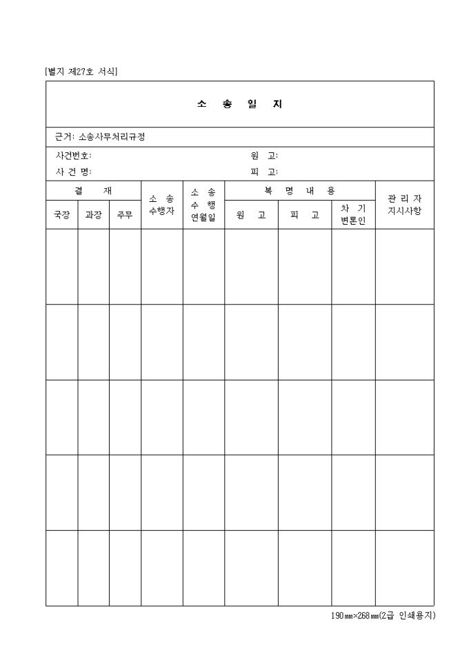 소송 수행자 소송 수행 연월일 복명내용 ( 원고 피고 차기변론인 ) 관리자 지시사항등의 항목이 포함되는 소송일지 양식입니다.