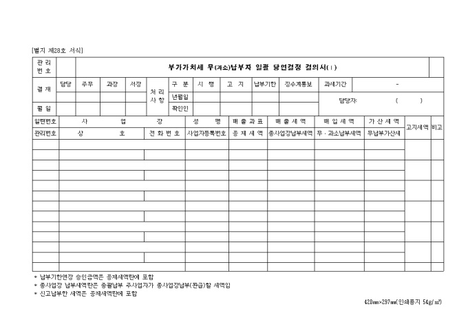 9,000원/월제28호 부가 가치세 무(과소)납부자 일괄 당연결정 결의서 양식입니다. 일련번호, 관리번호, 사업장, 상호, 전화번호, 성명, 사업자 등록번호, 매출과표, 공제세액 등을 기재합니다.