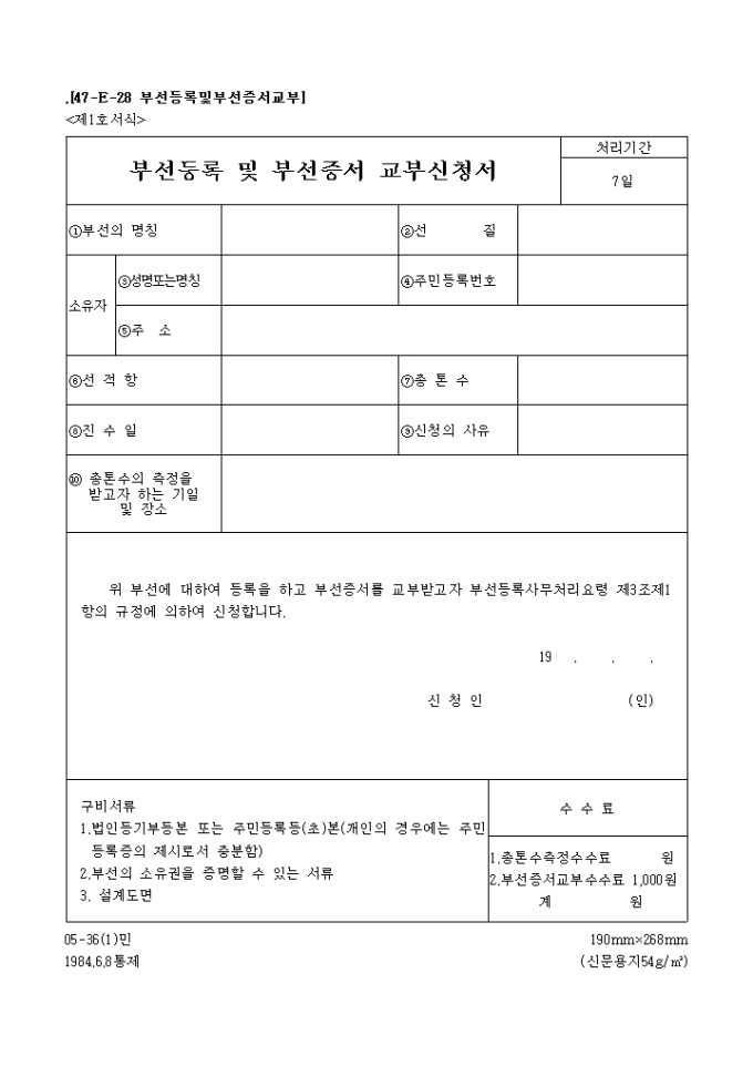 9,000원/월위 부선에 대하여 등록을 하고 부선증서를 교부받고자 부선등록사무처리요령 제3조제1항의 규정에 의하여 신청하고자 할 때 사용하는 "부선등록 및 부선증서 교부신청서" 양식입니다.