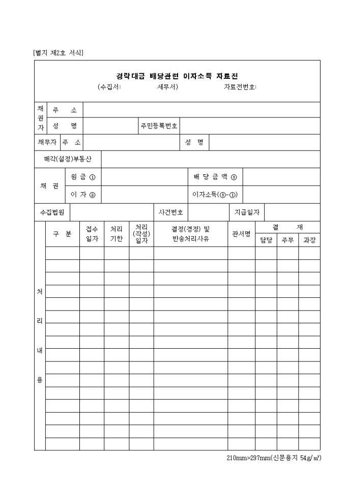 9,000원/월제2호 경락대금배당관련이자소득자료전 양식입니다. 채권자의 주소, 성명, 주민등록번호 채무자의 주소와 성명, 매각 부동산, 채권의 원금, 이자, 배당금액 등을 기재합니다.