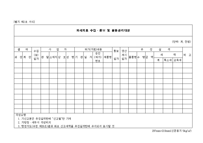 제2호 과세자료수집.통보 및 활용관리대장 양식입니다. 수집일자, 사업자(관할, 소재지, 상호, 성명),허가내용(기관, 일자, 승인번호, 제품명), 통보 일자, 생산 개시 일자, 추정(물품명, 수량, 금액, 세액), 비고 등을 기재합니다.