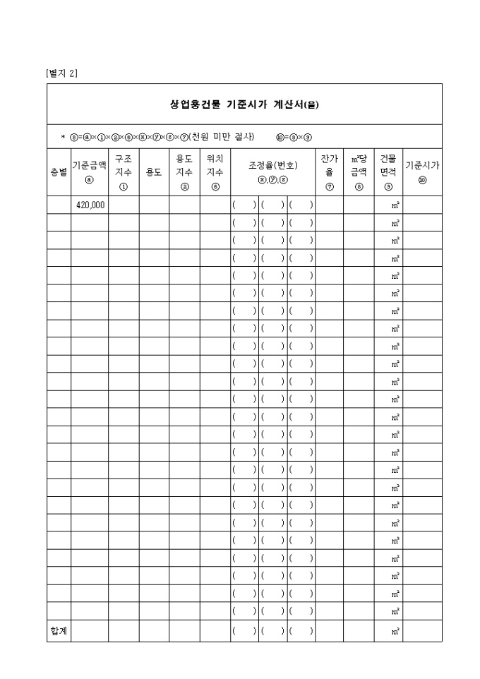 9,000원/월제2호 상업용 건물 기준 시가 계산서(을) 양식입니다. 기준금액, 구조 지수, 용도, 용도 지수, 위치 지수, 잔가율, 건물면적, 기준시가 등을 기재합니다.