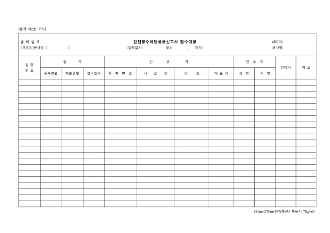 귀속일자 제출연월 접수일 신고인의 인적사항 (사업장 상호 대표자) 인수자 등의 항목을 기입하여 작성하는 원천징수 이행 상황신고서 접수대장 양식입니다.
