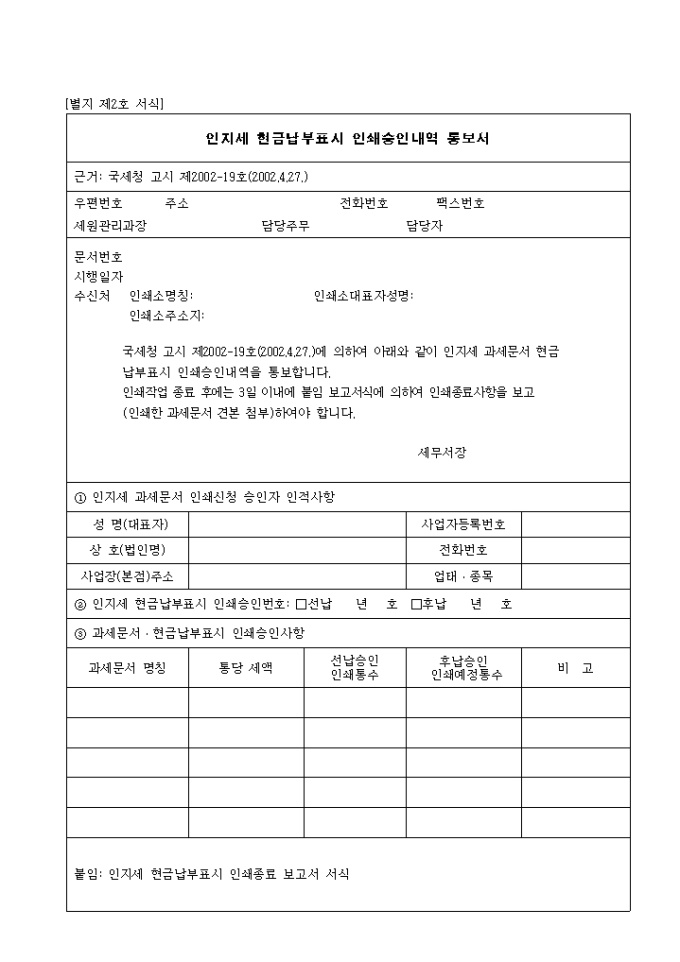 9,000원/월제2호 인지세 현금 납부 표시 인쇄 승인 내역 통보서 양식입니다. 인지세 과세문서 인쇄 신청 승인자 인적사항, 인지세 현금납부 표시 인쇄승인번호, 과세문서. 현금납부 표시 인쇄승인 사항 등을 기재합니다.