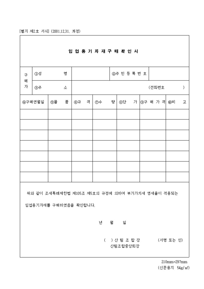 제2호 임업용기자재구매확인서 (2001.12.31. 개정) 구매자 성명 주소 주민등록번호 구매연월일 물품 규격 수량 단가 구매가격 비고 위와 같이 조세특례제한법 제105조 제5호의 규정에 의하여 부가가치세 영세율이 적용되는 임업용기자재를 구매하였음을 확인합니다.