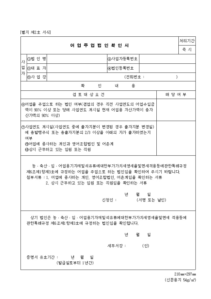 9,000원/월제2호 축산업주업법인 확인서 양식입니다. 법인명, 사업자등록번호, 대표자, 법인등록번호, 사업장 등을 기재합니다. 농·축산·임·어업용기자재및석유류에대한부가가치세영세율및면세적용등에관한특례규정 제6조제1항제3호에 규정하는 어업을 주업으로 하는 법인임을 확인하여 주시기 바랍니다.