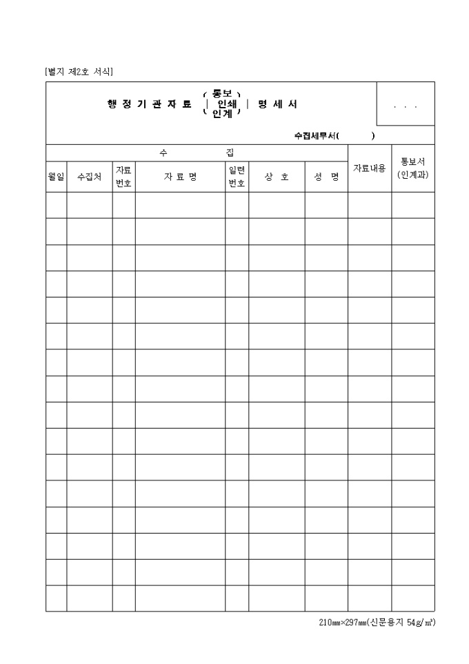 제2호 행정기관자료통보(이송.인계)명세서 양식입니다. 월일, 수집처, 자료 번호, 자료명, 일련번호, 상호, 성명, 자료 내용, 통보서 등을 기재합니다.