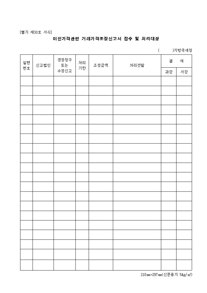 제30호 이전가격 관련 거래가격조정신고서접수 및 처리대장