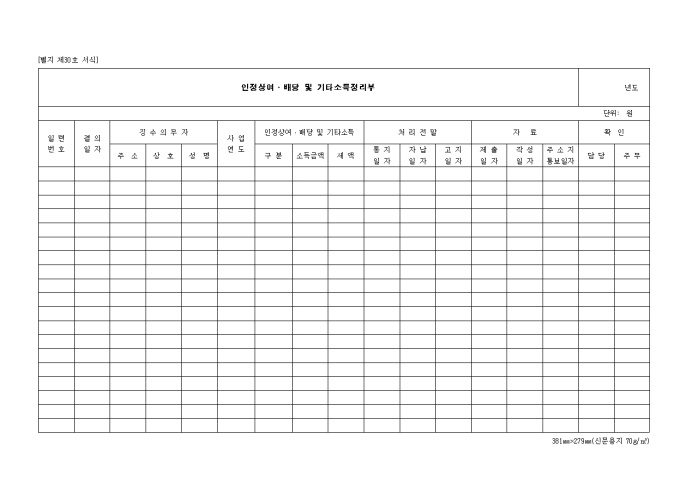 등의 항목을 기입하는 인정상여 배당 및 기타 소득 정리부 양식입니다.