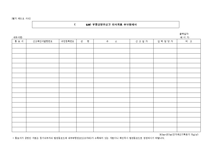9,000원/월제31호 부동산 양도신고 타서자료 수보명세서 양식입니다. 통보서, 신고확인서 발행번호, 주민등록번호, 성명, 주소, 신고일자, 입력 담당자, 비고 등을 기재합니다.