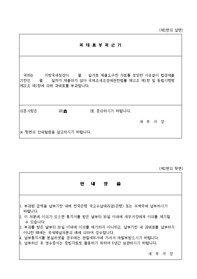 2. 이 처분에 이의가 있으면 통지서를 받은 날부터 30일 이내에 세무서장에게 이의를 제기할 수 있습니다.
