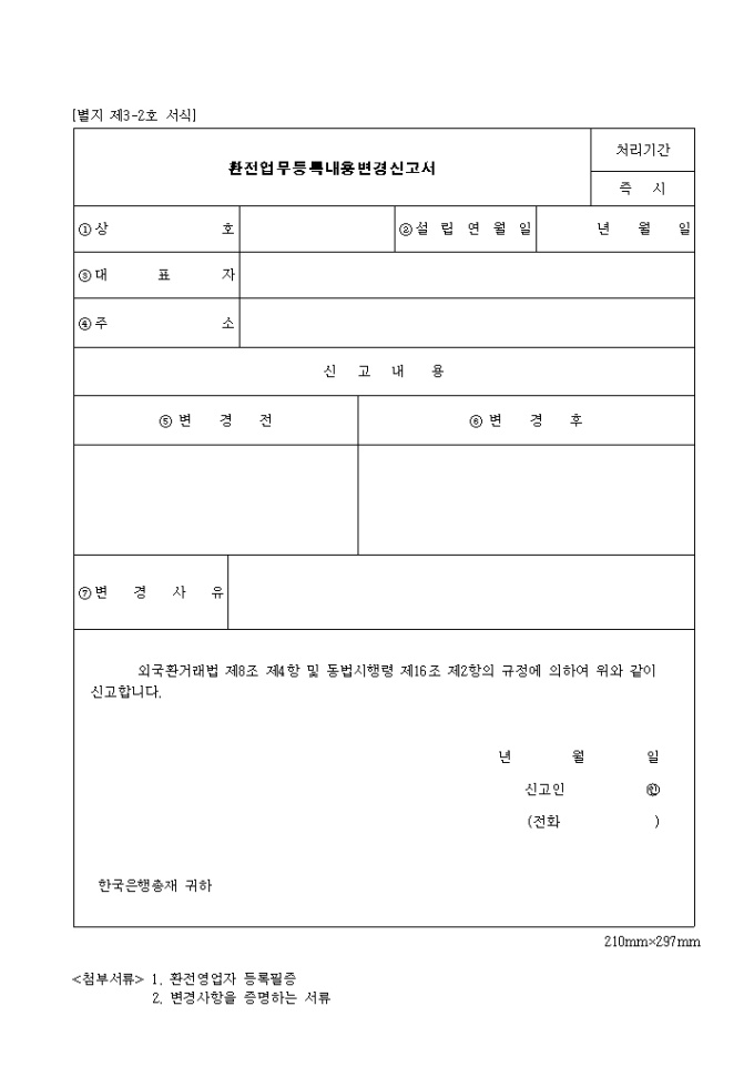 9,000원/월제3-2호 환전 업무 등록 내용 변경 신고서 양식입니다. 상호, 설립년월일, 대표자, 주소, 변경전, 변경후, 변경사유 등을 기재합니다.