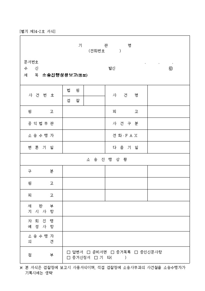 ※ 본 서식은 검찰청에 보고시 사용서식이며, 직접 검찰청에 소송사무과의 사건철을 소송수행자가 기록시에는 생략