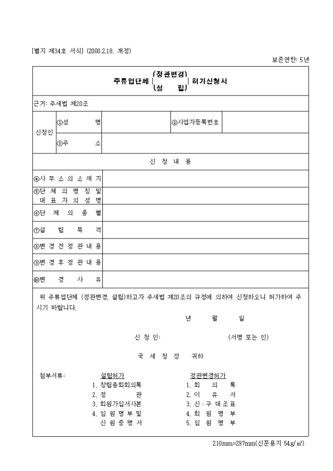 9,000원/월제34호 주류업단체(정관변경.설립)허가 신청서(2000.2.18. 개정) 양식입니다. 성명, 사업자 등록번호, 주소, 사무소의 소재지, 단체의 명칭 및 대표자의 성명, 단체의 종별, 설립 목적, 설립 목적, 변경전정관내용, 변경 후 정관 내용, 변경 사유 등을 기재합니다.