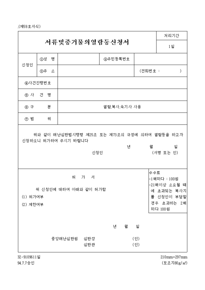 위와 같이 해난심판법시행령 제25조 또는 제73조의 규정에 의하여 열람등을 하고자 신청하오니 허가를 득하고자 할 때 사용하는 "서류 및 증거물의 열람등신청서" 양식입니다.