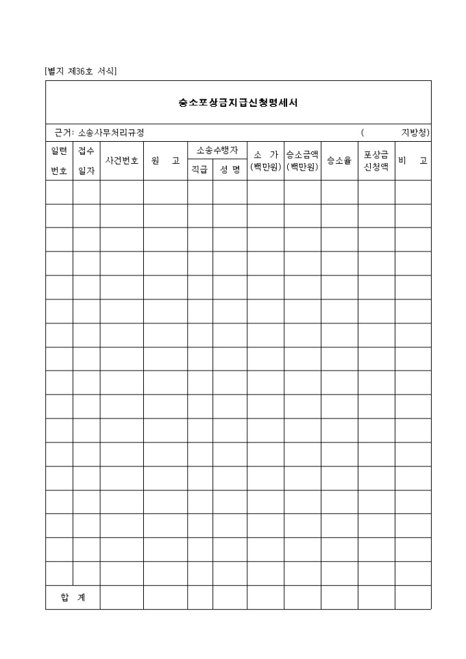 9,000원/월제36호 승소포상금지급신청 명세서 양식입니다. 일련번호, 접수일자, 사건번호, 원고, 소송수행자, 소가, 승소금액, 승소율, 포상금 신청액, 비고 등을 기재합니다.