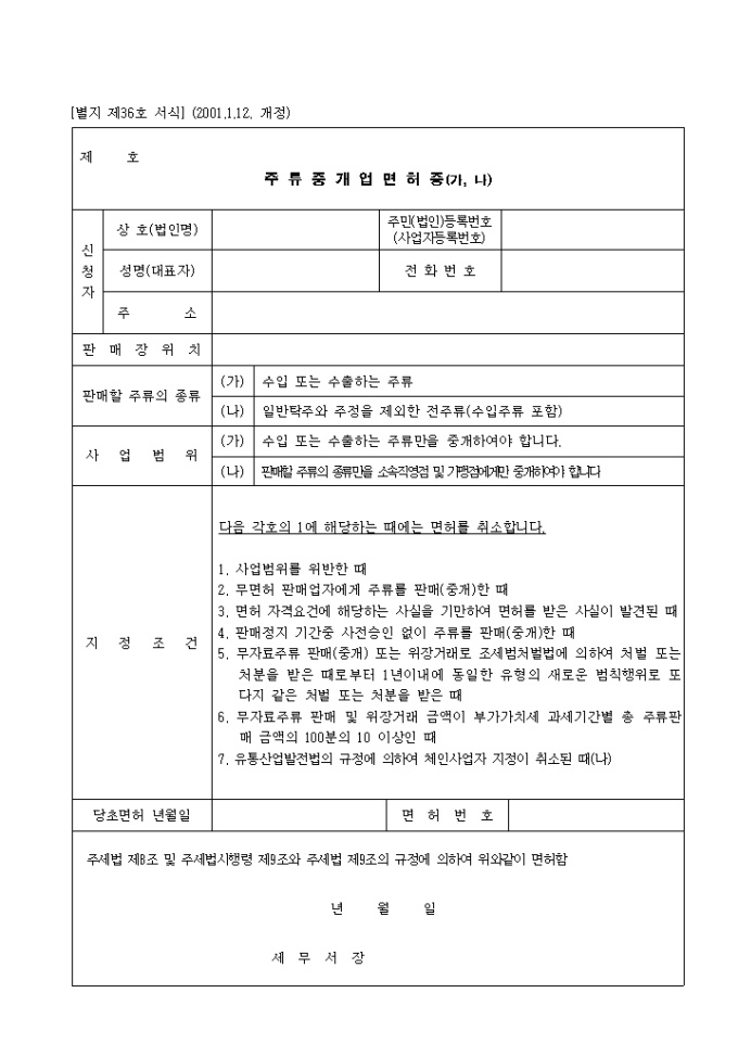 9,000원/월제36호 주류 중개업 면허증(가)(2001.1.12. 개정) 양식입니다. 신청자(상호, 주민등록번호, 성명, 전화번호, 주소), 판매장위치, 판매할 주류의 종류, 사업범위 등을 기재합니다.