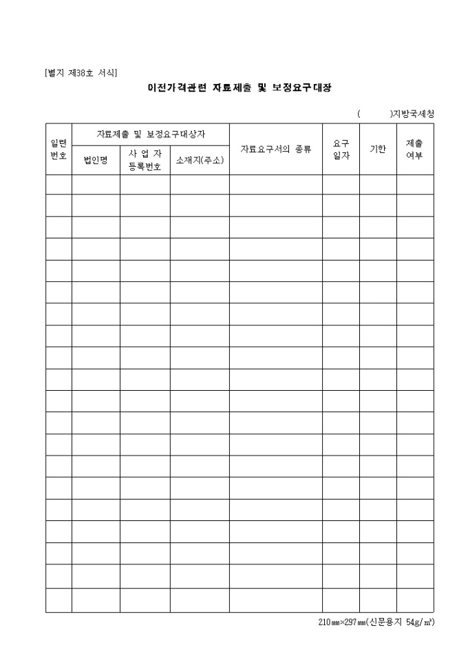 제38호 이전가격관련 자료제출 및 보정요구대장 양식입니다. 일련번호, 자료제출 및 보정요구 대상자, 자료 요구서의 종류, 요구일자, 기한, 제출여부 등을 기재합니다.