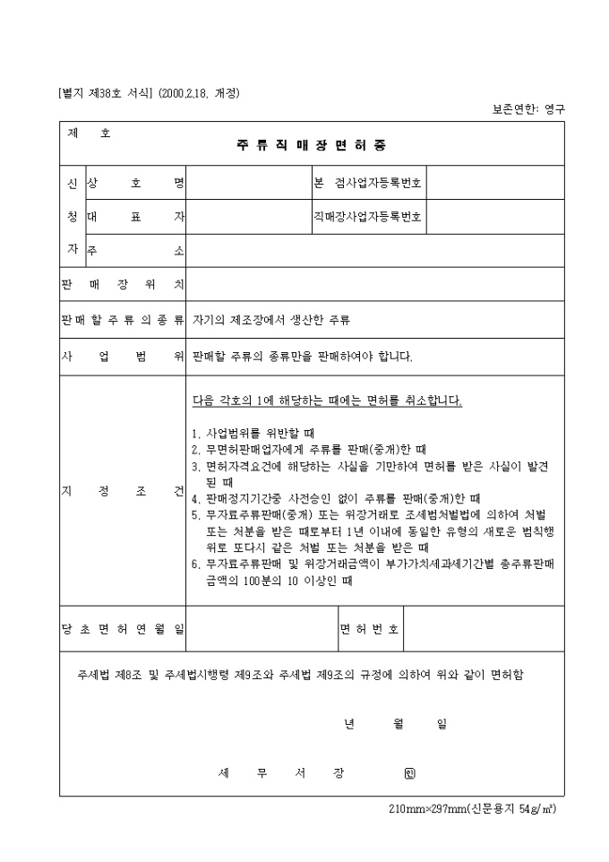 제38호 주류직매장면허증(2000.2.18. 개정)