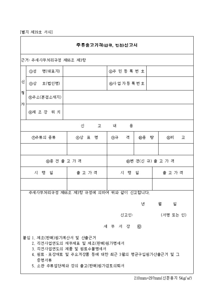 9,000원/월제39호 주류출고가격(신규, 변경)신고서 양식입니다. 성명, 주민등록번호, 상호, 사업자 등록번호, 주소, 제조장 위치, 주류의 종류, 상표명, 규격, 용량, 비고, 종전출고가격, 변경 출고가격 등을 기재합니다.