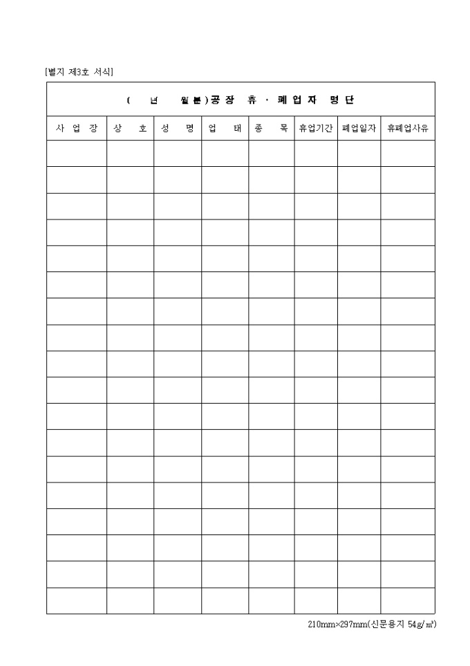 제3호 공장휴 폐업자명단 양식입니다. 사업장, 상호, 성명, 업태, 종목, 휴업기간, 폐업일자, 휴폐업 사유 등을 기재합니다.