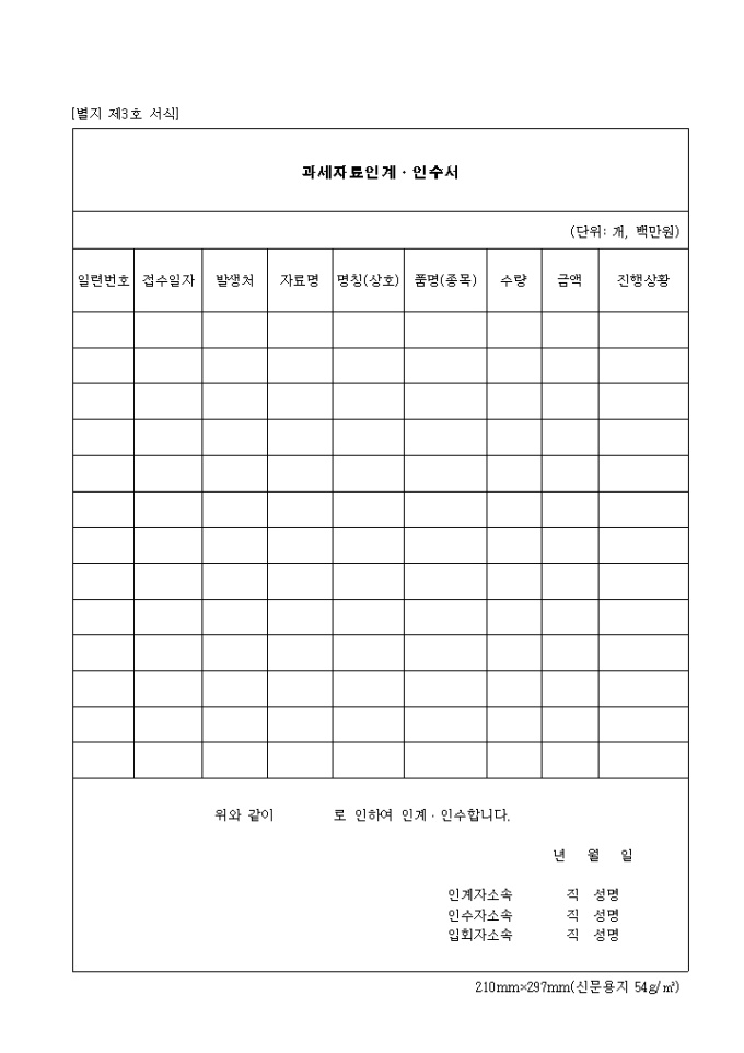 일련번호 접수일자 발생처 자료명 명칭 상호 품명 종목 수량 금액 진행상황 등의 항목이 포함된 과세자료 인계 인수서 양식입니다.