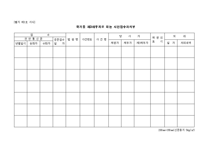 9,000원/월제3호 국가를 제3채무자로 하는 사건접수처리부 양식입니다. 접수, 법원명, 사건번호, 사건명, 당사자, 채권의 표시, 처리 등을 기재합니다.