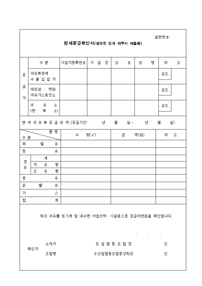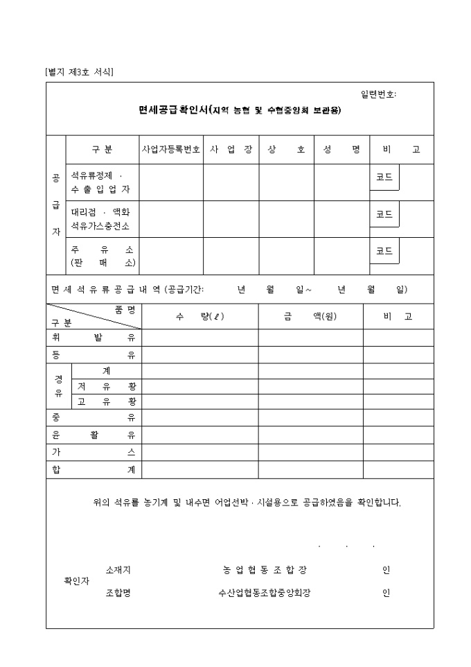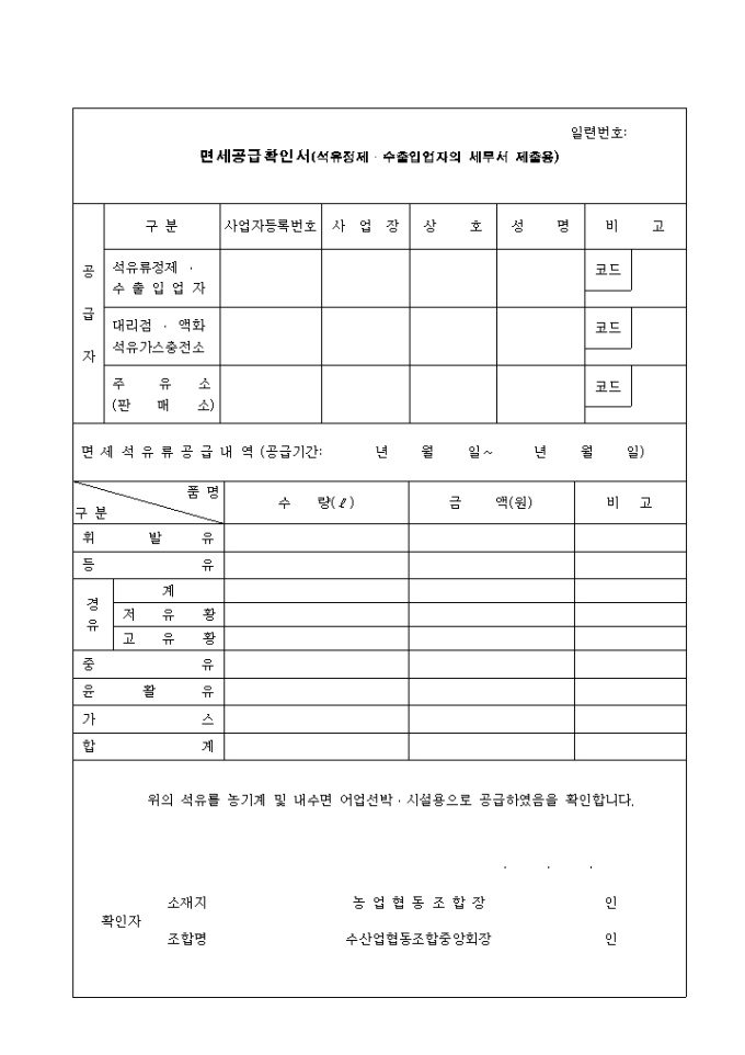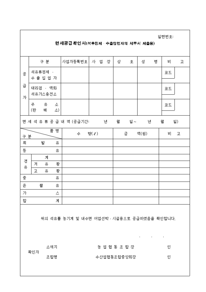 9,000원/월제3호 면세공급확인서 사업자등록번호 사업장 상호 성명 비고 면세석유류공급내역등의 항목을 기입하여 작성하는 면세공급확인서 양식입니다.
