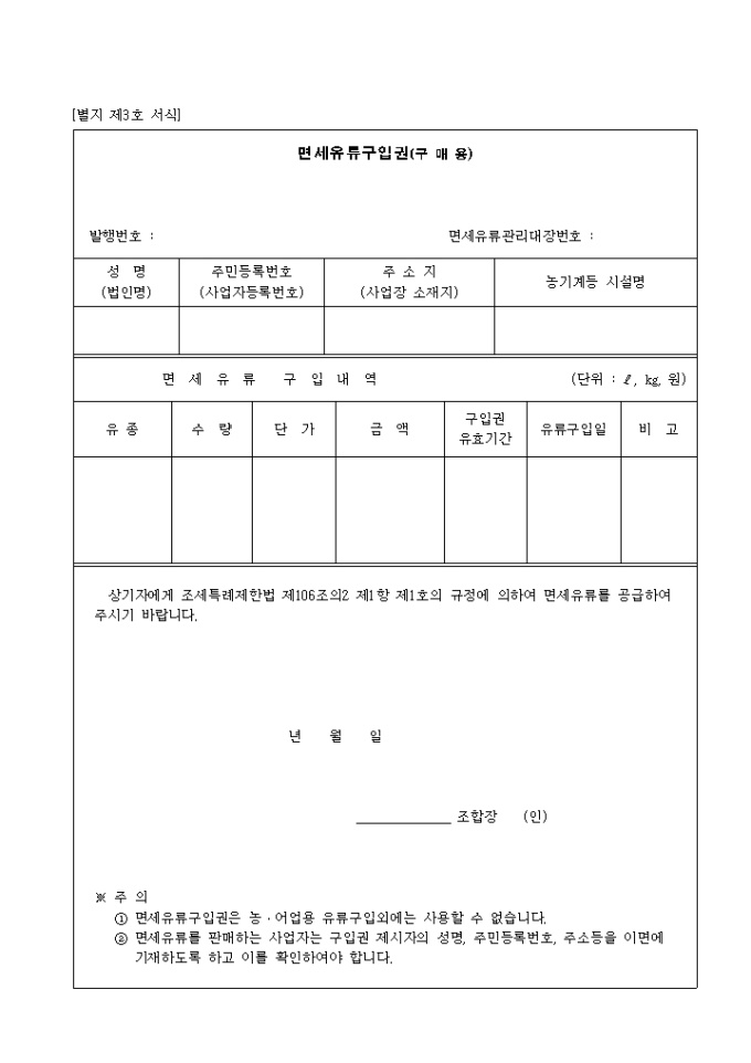 상기자에게 조세특례제한법 제106조의2 제1항 제1호의 규정에 의하여 면세유류를 공급하여 주시기 바랍니다.