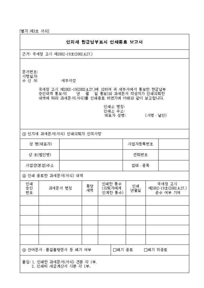 9,000원/월제3호 인지세현금납부표시인쇄종료 보고서 양식입니다. 국세청 고시 제2002-19(2002.4.27.)에 의하여 귀 세무서에서 통보한 현금납부