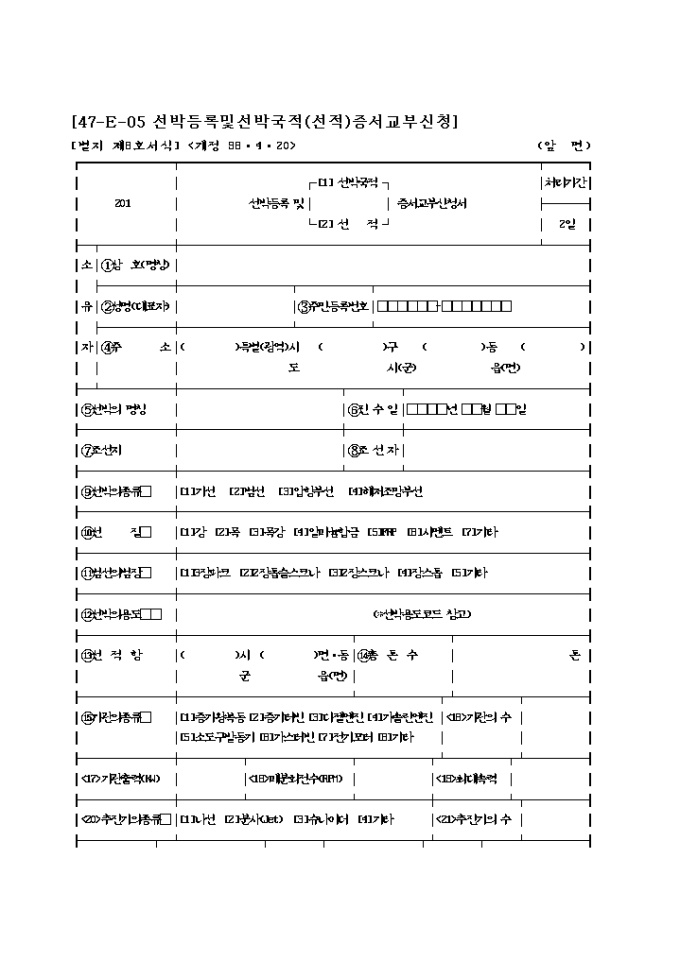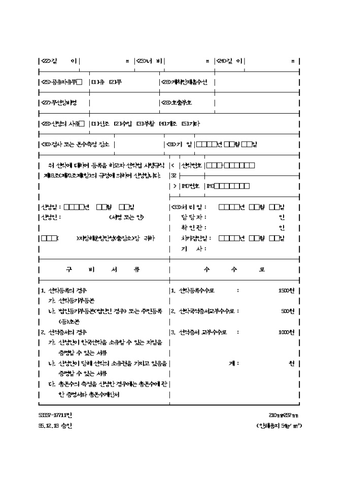 9,000원/월위 선박에 대하여 등록을 하고자 선박법 시행규칙 제18조(제70조제1항)의 규정에 의하여 신청하고자 할 때 사용하는 "선박등록 및 (선박국적,선적) 증서교부 신청서" 양식입니다.