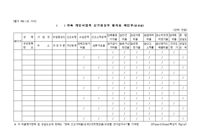 ※ 각 비율평가항목 및 성실도순위 란에는 "당해 신고자비율(순위)/전국평균율(규모별 전사업자수)"를 기재함