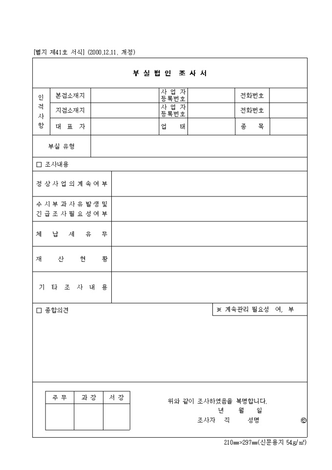 9,000원/월제41호 부실법인조사서 (2000.12.11. 개정) 양식입니다. 인적사항, 부실유형, 조사내용, 종합의견 등을 기재합니다.