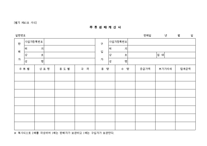 9,000원/월제41호 주류판매계산서 주류별 상표명 용도별 규격 용량 등의 항목을 기입하고 ※ 복사식으로 2매를 작성하여 1매는 판매자가 보관하고 1매는 구입자가 보 관한 다.