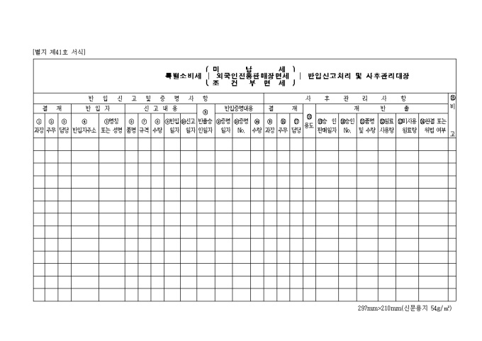 9,000원/월반입자, 신고내용, 반출승인일자, 반입증명내용, 재반출 등을 기록하여 관리하는 제41호 특별소비세(미납세.수출 및 군납.외교관면세.외국인전용면세.조건부면세.무조건면세)반입신고처 양식입니다.
