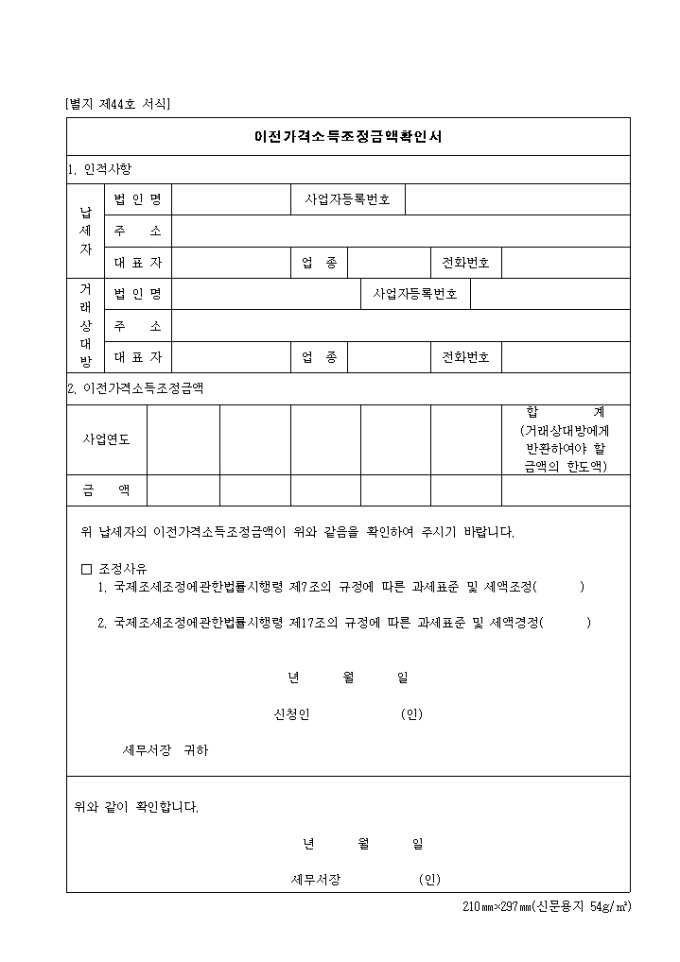 9,000원/월납세자의 이전가격소득조정금액 확인을 요하는 제44호 이전가격소득조정금액확인서 양식입니다.
