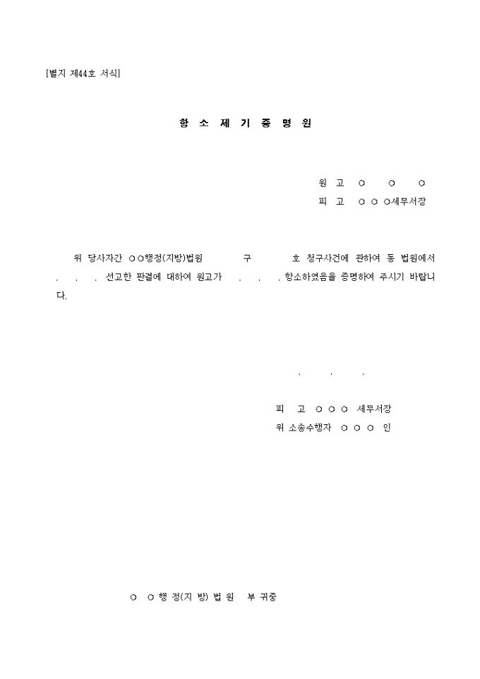 9,000원/월제44호 항소제기 증명원 양식입니다. 위 당사자간 ○○행정(지방)법원 구 호 청구사건에 관하여 동 법원에서 . . . 선고한 판결에 대하여 원고가 . . . 항소하였음을 증명하여 주시기 바랍니다.