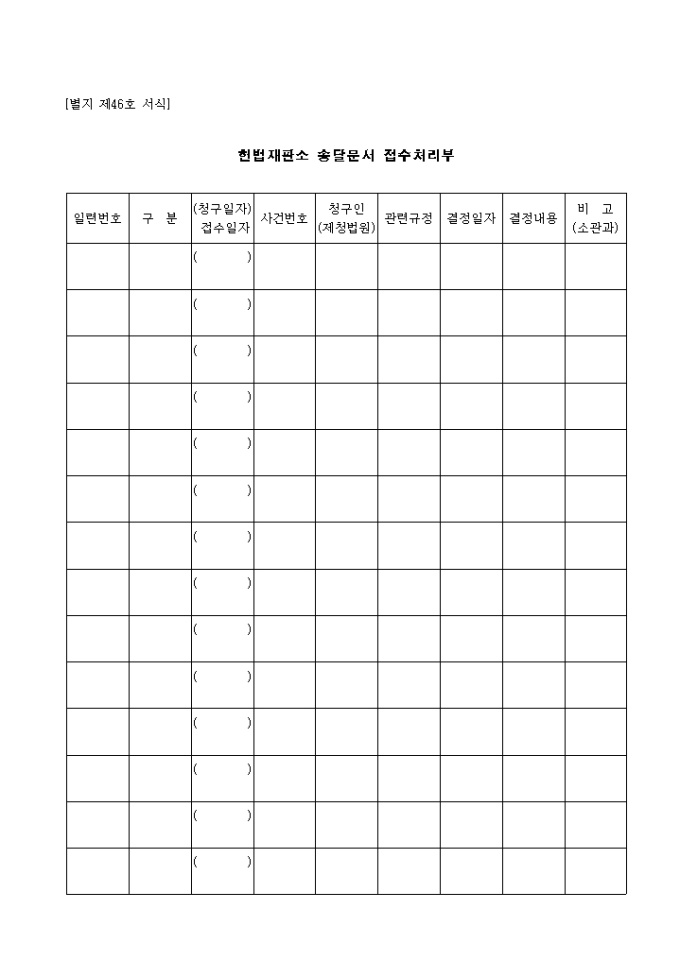 청구일자, 접수일자, 사건번호, 청구인, 제청법원, 관련규정, 결정일자, 결정내용 등을 기록하여 접수하는 제46호 헌법재판소송달문서접수처리부 양식입니다.