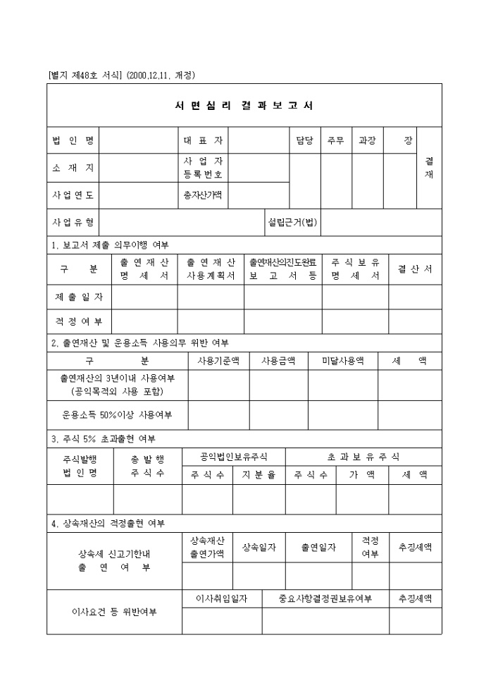 9,000원/월제48호 서면심리결과 보고서 (2000.12.11. 개정) 양식입니다. 1. 보고서 제출 의무이행 여부 2. 출연재산 및 운용소득 사용의무 위반 여부 3. 주식 5% 초과출현 여부