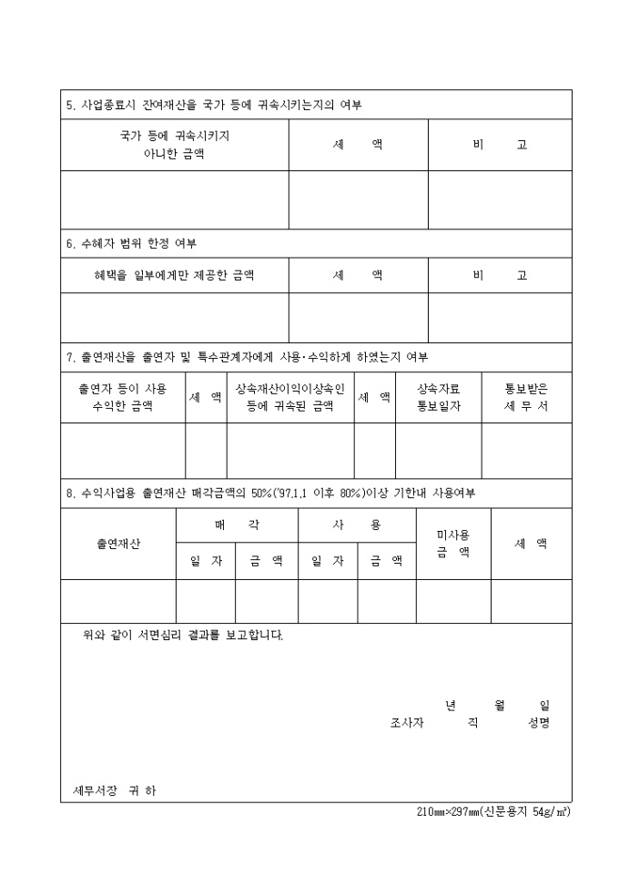 4. 상속재산의 적정출현 여부 5. 사업종료시 잔여재산을 국가 등에 귀속시키는지의 여부 6. 수혜자 범위 한정 여부 7. 출연재산을 출연자 및 특수관계자에게 사용 수익하게 하였는지 여부 8. 수익사업용 출연재산 매각금액의 50%(´97.1.1 이후 80%)이상 기한내 사용여부