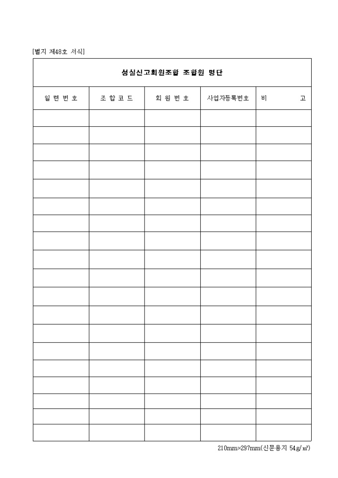 일련번호 조합코드 회원번호 사업자등록번호 비고 등의 항목을 기입하여 작성하는 성실신고회원조합 조합원명단 양식입니다.