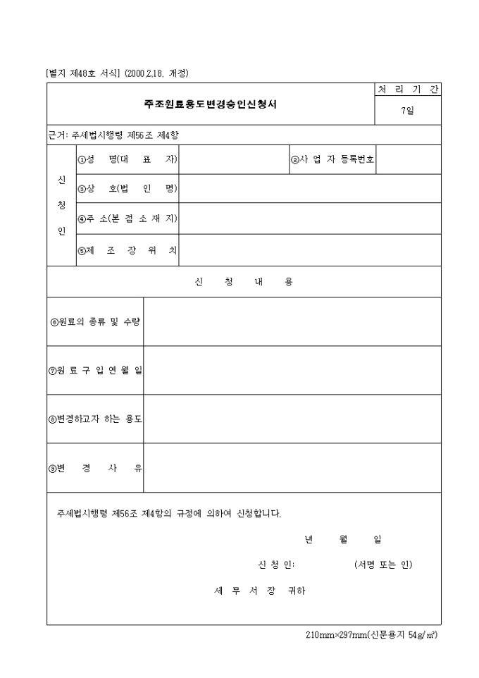9,000원/월제48호 주조원료용도 변경승인 신청서(2000.2.18. 개정) 양식입니다. 신청인의 성명, 사업자 등록번호, 상호, 주소, 제조장 위치, 신청내용 등을 기재합니다.
