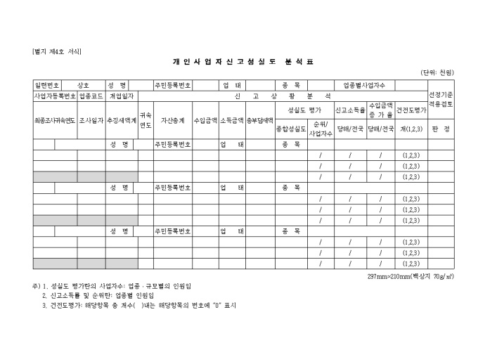 9,000원/월최종조사귀속연도, 조사일자, 추징세액계, 귀속연도, 자산총계, 수입금액, 소득금액, 총부담세액, 성실도평가 등을 기록하여 분석하는 제4호 개인사업자신고성실도분석표 양식입니다.